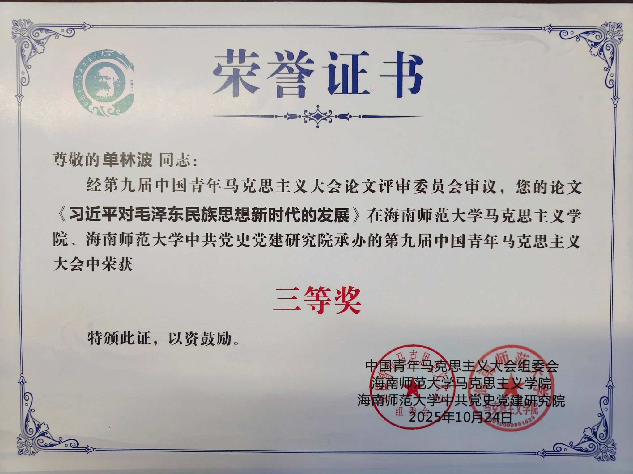 日前,第九届中国青年马克思主义大会在海南师范大学闭幕。我校马克思主义学院单林波老师的论文《习近平对毛泽东民族思想新时代的发展》荣获三等奖,实现我校在该项全国性学术盛会中的新突破。