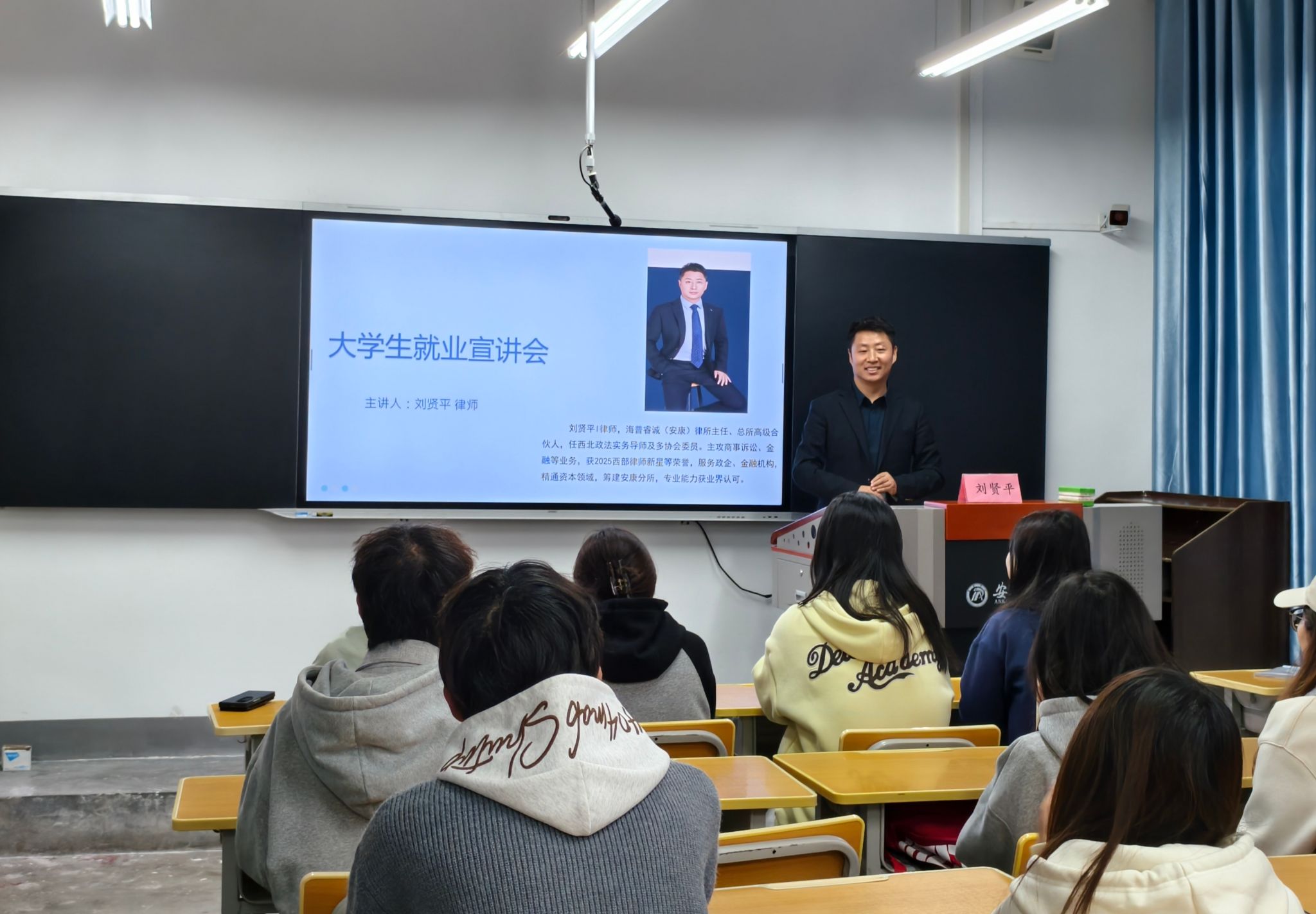 宣讲会上,律师事务所负责人刘贤平主任系统介绍了事务所的业务布局和人才需求情况。针对应届毕业生特点,分享了事务所业务、行政等岗位的典型工作内容。他结合具体案例,强调了专业基础知识、实践能力和职业素养在职场发展中的重要性,并分析了法治中国建设背景下法律相关行业的广阔前景,鼓励同学们夯实专业基础,注重实践锻炼。