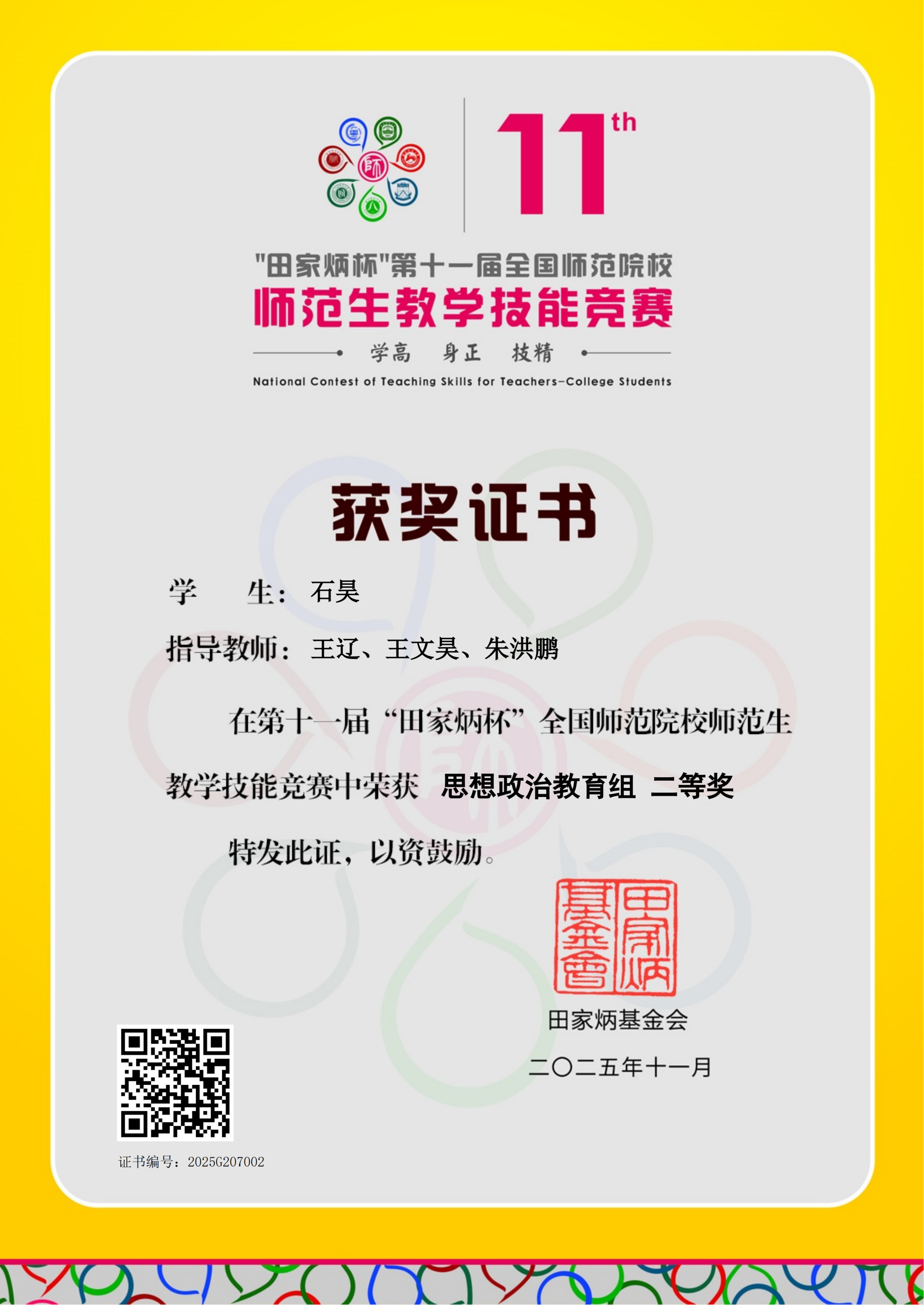 2025年11月28日至30日,第十一届“田家炳杯”全国师范院校师范生教学技能竞赛在浙江师范大学成功举办。马克思主义学院思想政治教育专业石昊同学历经院内遴选、全国初赛及总决赛多轮激烈比拼,凭借扎实的教学设计功底、娴熟的课堂驾驭能力与鲜明的师范专业风采脱颖而出,最终斩获二等奖。这一成绩不仅展现了石昊同学的个人实力,更彰显了马克思主义学院在师范生培养领域的扎实成效,生动诠释了新时代师范生坚守教育初心、涵养师者仁心、勇担育人使命的精神内核。
