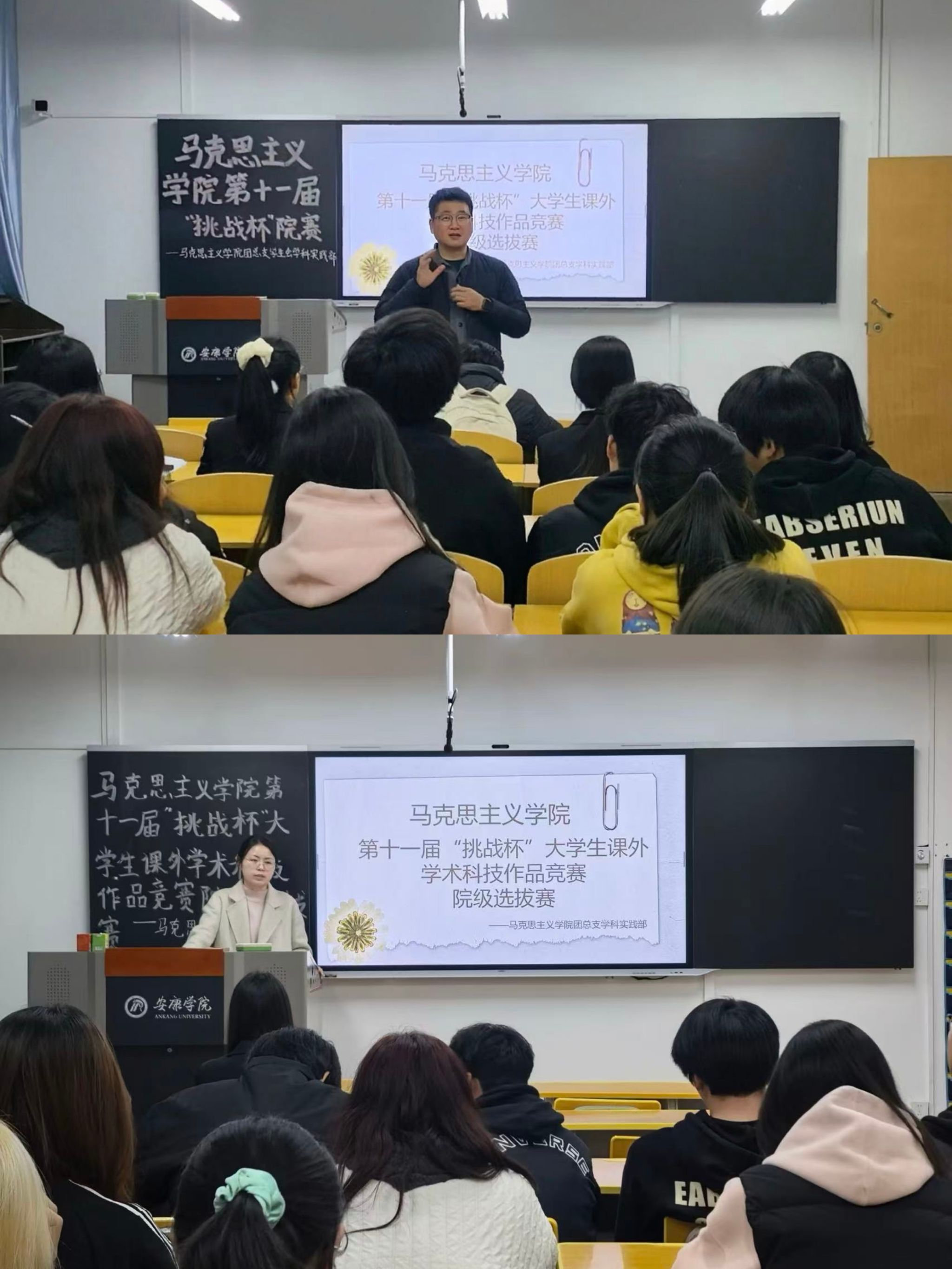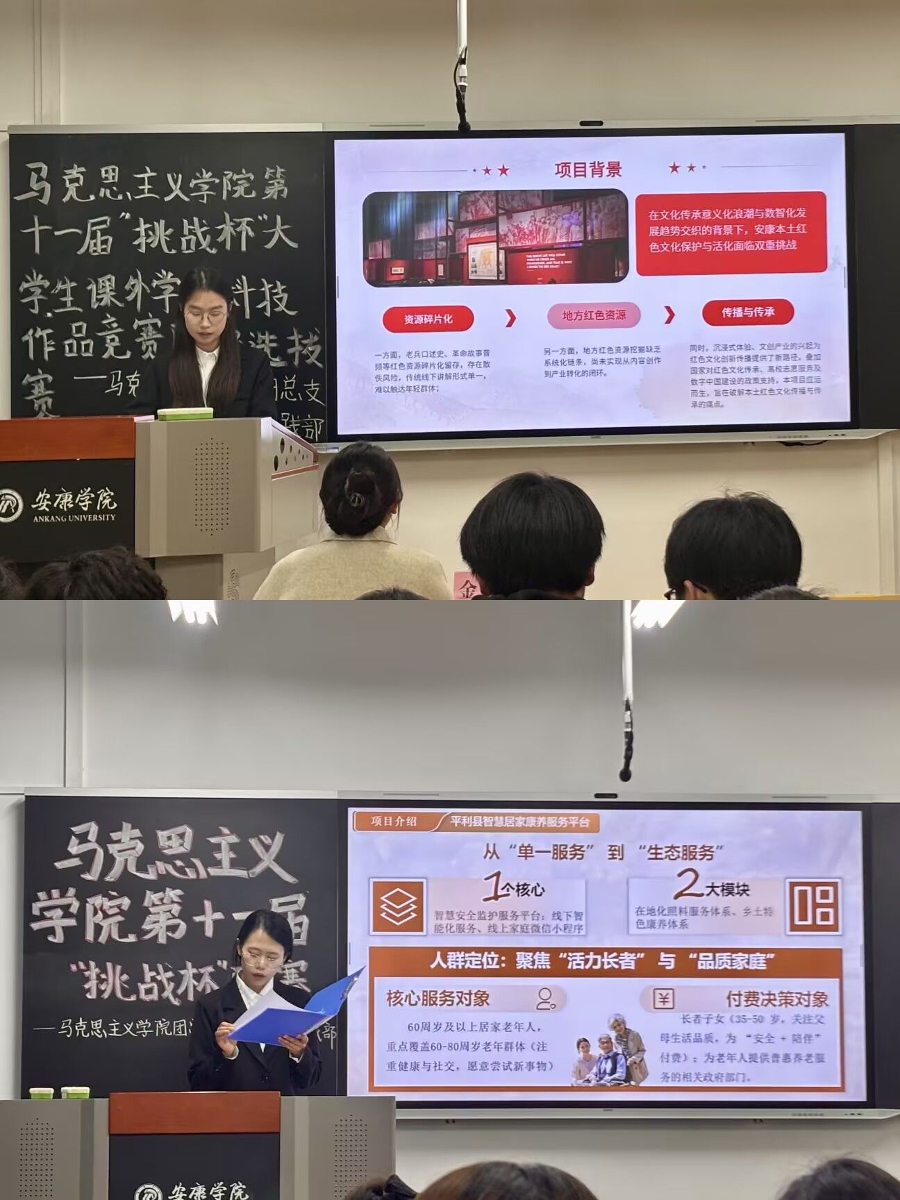 以赛促学,以思践行。为深入贯彻落实创新创业教育理念,激发我院学子创新精神与实践能力,2026年3月23日马克思主义学院第十一届“挑战杯”大学生创业计划竞赛院内选拔赛顺利举行。团总支书记王晓、学工办主任唐丹、辅导员金粲璨担任评委,全体参赛团队及学生代表参加。