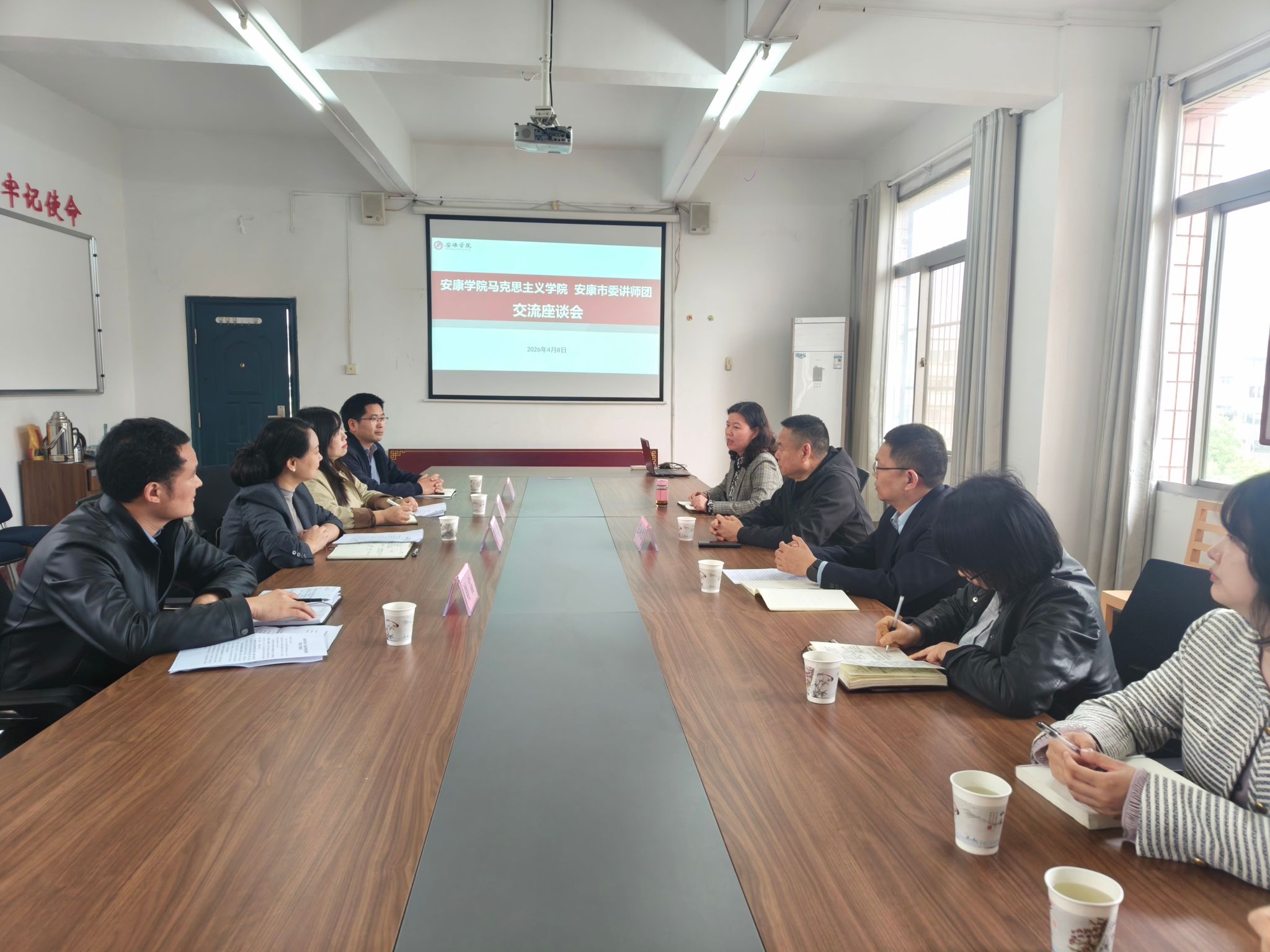 4月8日下午,安康市委讲师团团长王苗一行与马克思主义学院举行合作交流座谈会。双方围绕理论研究、宣讲实践、人才共育等议题深入交流,共同探讨校地协同发展的新路径。校党委副书记、纪委书记、监察专员安永强,马克思主义学院领导班子成员及教师代表参加会议,会议由马克思主义学院党总支书记黄娟主持。
