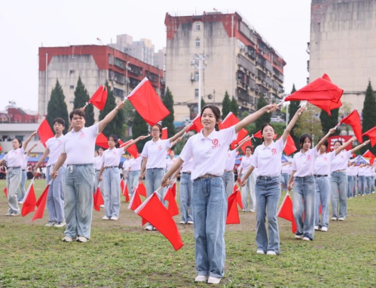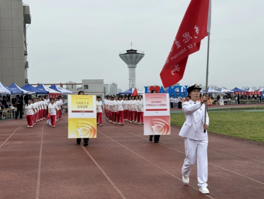 开幕式上,马克思主义学院方阵步履铿锵、意气风发,以整齐划一的步伐昂首阔步迈向主席台。学子们手执红扇,伴着《我和我的祖国》的悠扬旋律翩然起舞,规范舒展的动作、饱满炽热的情怀、铿锵有力的口号,尽显学院师生昂扬向上、朝气蓬勃的精神气象,为本届运动会奏响激昂澎湃的青春序章。