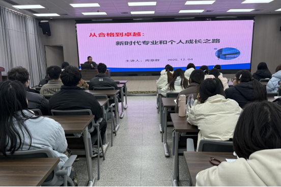 在“校友大讲堂”环节,周章群校长以“从合格到卓越:新时代专业和个人成长之路”为题,紧扣“四有好老师”标准,结合自身从青年教师到教共体校长的成长历程,为同学们详细拆解了从合格教师到卓越教育者的进阶路径。“有理想信念”是从合格走向卓越的“精神基石”,理想信念应融入对教育事业的忠诚与对学生价值观的引领;“有道德情操”是卓越教育者的“立身之本”,教师的道德情操体现在每一个细微的关怀之中;“有扎实学识”是教师的核心底气,教师不仅要精通专业、了解学生,还需掌握技术、不断学习;“有仁爱之心”是连接师生的“情感纽带”,仁爱并非口号,而是学生进步时的欣慰,面对犯错时的包容。整场分享通过真实的教育经历,将“四有好老师”标准串联起来,使同学们清晰地看到了“从合格到卓越”的每一步努力方向。