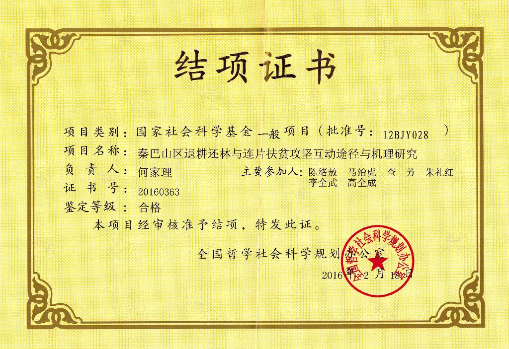 接全国哲学社会科学领导办公室通知,在2016年2月国家社科基金项目结题鉴定中,由我校政治与社会发展学院何家理教授主持的“秦巴山区退耕还林与连片扶贫攻坚互动途径及机理研究”通过结题鉴定。