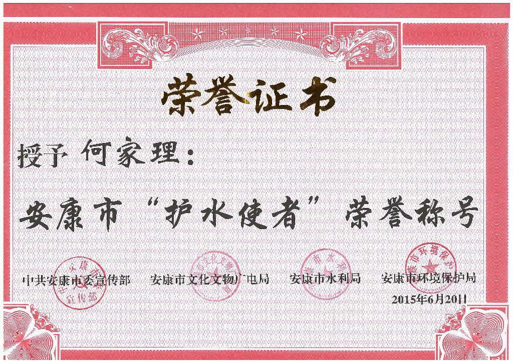 为了表彰在南水北调中线工程保护水源中作出突出贡献的个人,安康市委宣传部、市文化文物广电局、市环境保护局、市水利局等四家单位在2015年6月20日汉江龙舟节之际开展了首届安康市“护水使者”评选活动,我系主任何家理教授获得首届安康市“护水使者”荣誉称号,并推荐为龙舟节龙头点睛。
