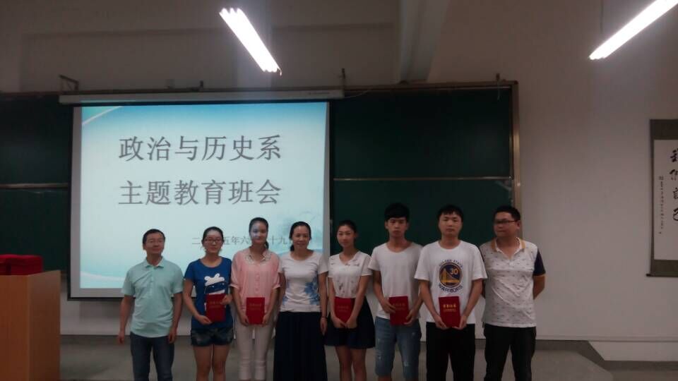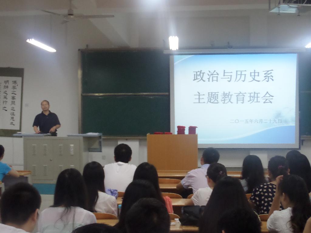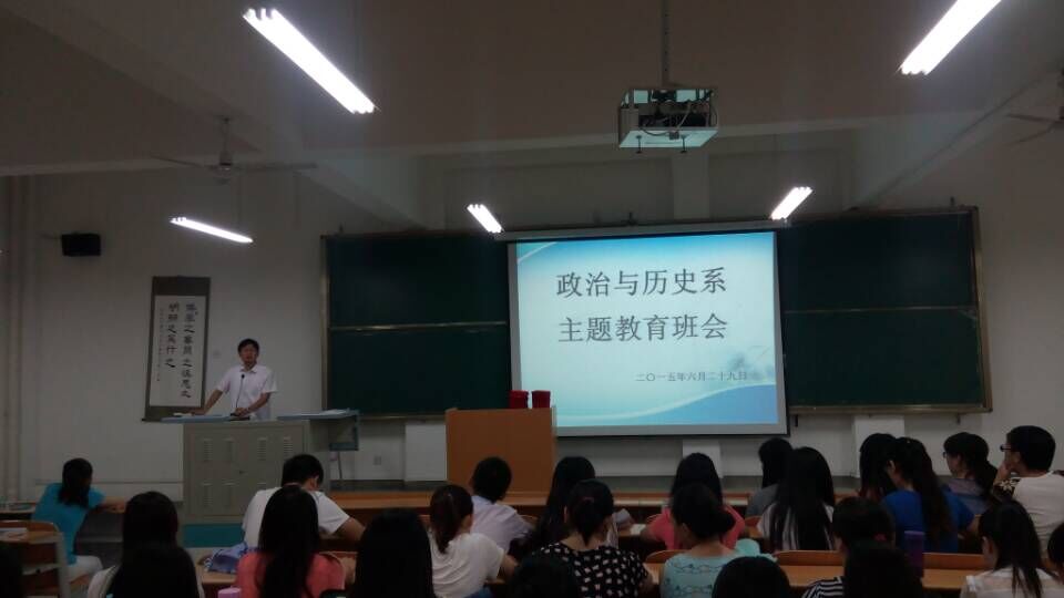 在建党94周年来临之际,政治与历史系于2015年6月29日在江北1201教室召开了主题教育班会,会议由系党总支书记谢安国主持,参加会议的有我系入党积极分子,部分学生代表,系副主任吴亚娥、单林波,系办公室主任郑治国,辅导员陈卓。