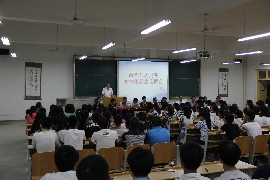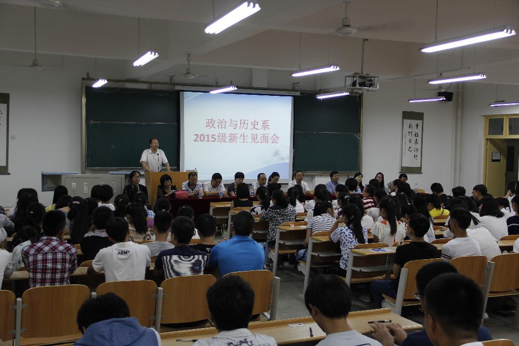 系主任何家理教授首先代表全体师生对2015级同学的到来表示热烈欢迎;接着从安康地区简介、安康学院发展历程、政治与历史系概况等三个方面给同学们做了全面的介绍,使同学们对自己所处的环境及将要学习的专业有了初步的认识,对学好专业充满了信心;最后,对同学们提出了几点希望,希望同学们尽快融入大学生活、希望同学们处理好各种关系尽快适应新环境。