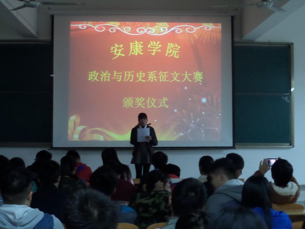 首先,进行了安康学院政治与历史系征文大赛颁奖仪式。袁娟、李欢欢同学为大家演讲了获奖征文,其激扬顿挫的演讲使大家以史为鉴,爱我中华,展现了我系同学的风采。政史系学生会主席、史鉴学社社长、大学生记者团副团长等人为获奖同学颁发奖状,大赛一等奖获得者李欢欢同学发表获奖感言,赢得大家的掌声阵阵。接着,进行了安康学院第八届“学海纵横”启动仪式,由学生会主席陈浩开启第八届“学海纵横”活动。最后,进行了学海纵横”活动的初赛环节,政史系代表队与农生代表队开始比赛,经过激烈的比赛,政史系代表队获得了初赛的胜利,进入复赛。