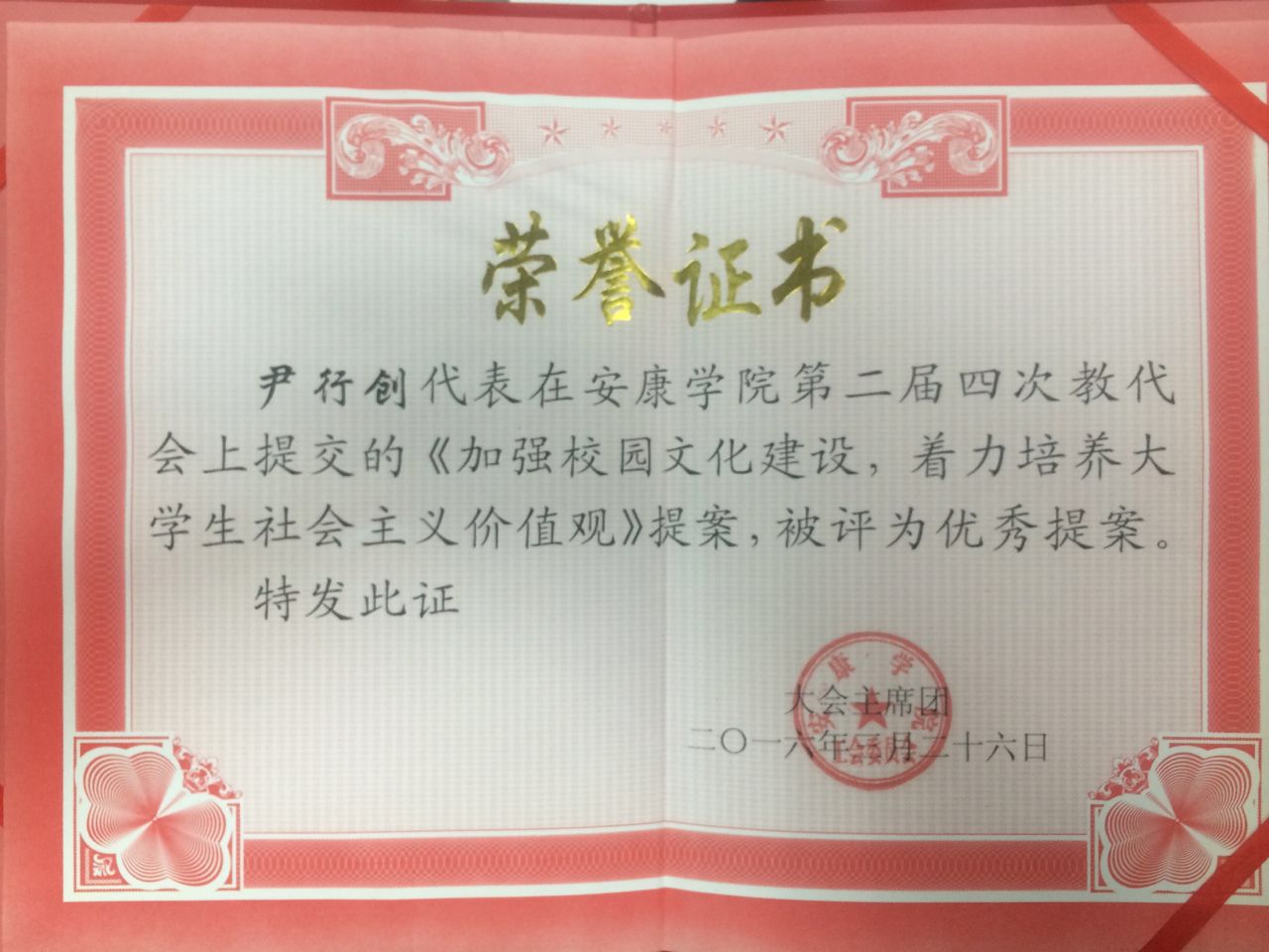 我院尹行创老师代表安康学院第二届四次教代会上提交的《加强校园文化建设,着力培养大学生社会主义价值观》提案,被评为优秀提案。