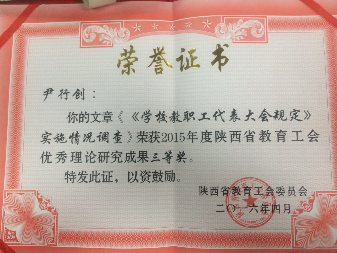 我院尹行创老师的文章《 <学校教职工代表大会规定> 实施情况调查》荣获2015年度陕西省教育工会优秀理论研究成果三等奖。