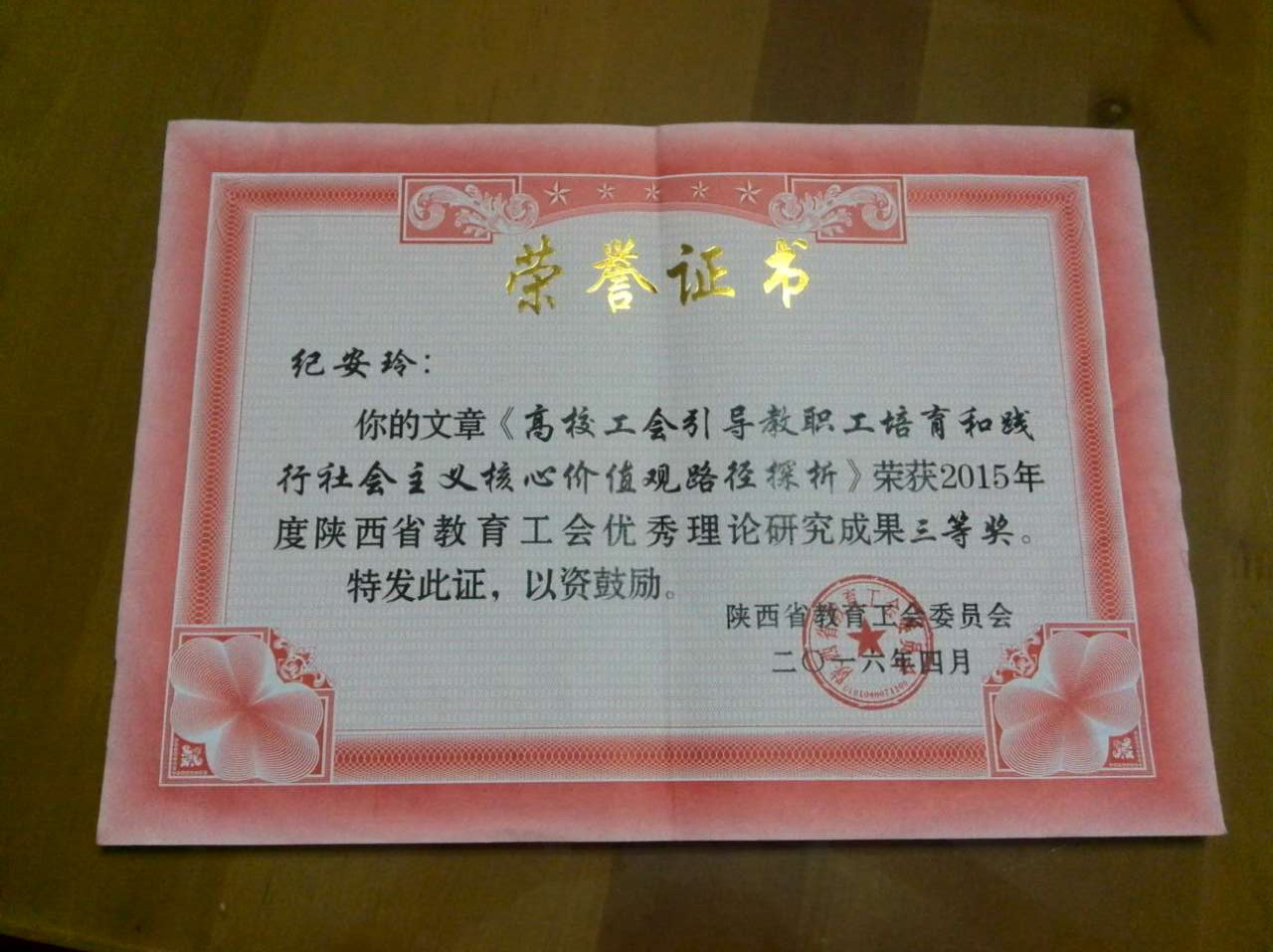 我院纪安玲老师的文章《 高校工会引导教职工培育和践行社会主义核心价值观路径探析》荣获2015年度陕西省教育工会优秀理论研究成果三等奖。