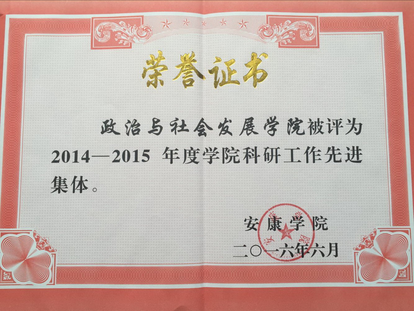 据2016年6月3日学校文件公布:政治与社会发展学院被评为“安康学院2014-2015年度科研先进集体”,本次全校共有两个二级学院被评为科研先进集体。政治与社会发展学院自2012年以来,连续四年被评为学校科研先进集体。