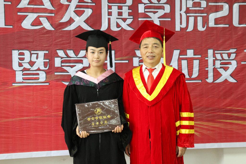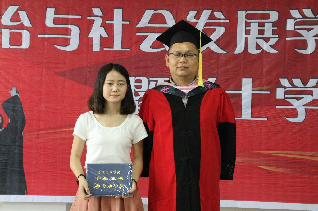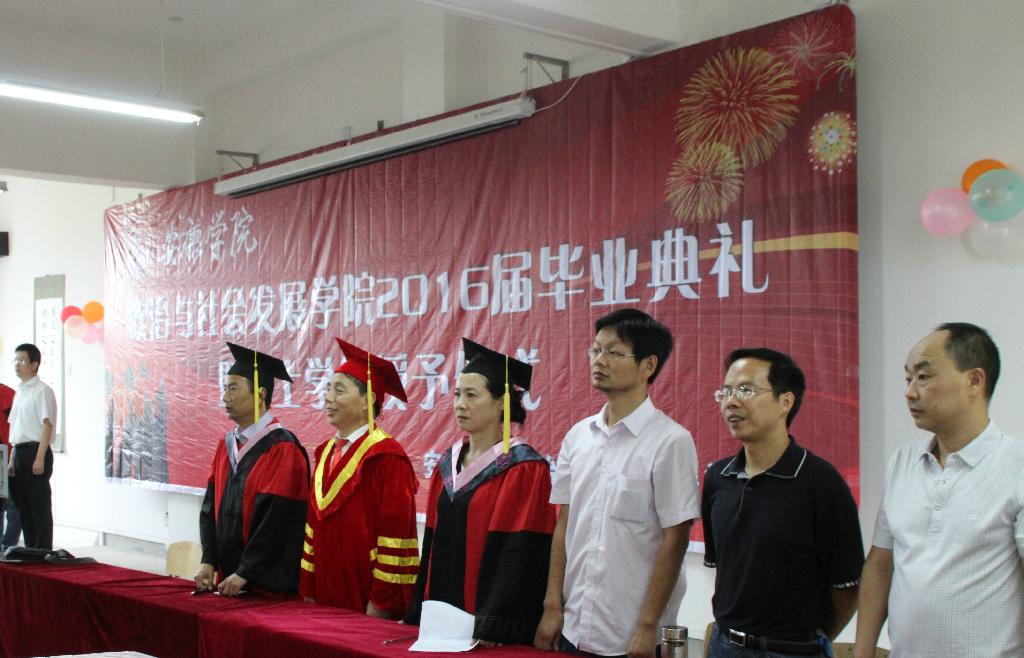 之后,学校党委副书记胡鸿晓教授为思想政治教育专业2012级1班学生拨穗并颁发了学士学位证书;政社学院院长何家理教授、政社学院副院长吴亚娥副教授为社会工作专业2012级1班学生拨穗并颁发了学士学位证书;政社学院副院长单林波老师为历史教育2013级1班学生颁发了毕业证书。