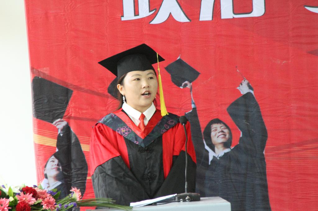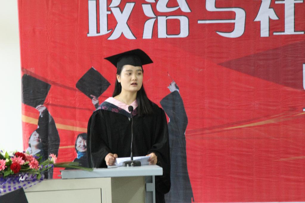 我院思想政治教育2012级1班何梦焕同学代表2016届全体毕业生发言,她深情回顾了大学四年的学习生涯,感谢学校和老师的悉心培育,并表示在未来的人生道路上会始终铭记母校的谆谆教导,不辱使命,砥砺前行。