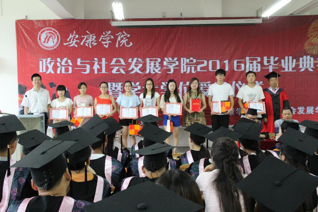 典礼在雄壮激昂的国歌声中拉开帷幕。在全体毕业生热烈的掌声中,学院副院长吴亚娥副教授宣读《安康学院关于对2016届优秀毕业生的表彰决定》和《政治与社会发展学院关于对2015-2016学年度学习标兵的表彰决定》。政社学院院长何家理教授为安康学院2016届优秀毕业生和政治社会发展学2015-2016学年度学习标兵颁奖,并为2016届毕业典礼致辞。
