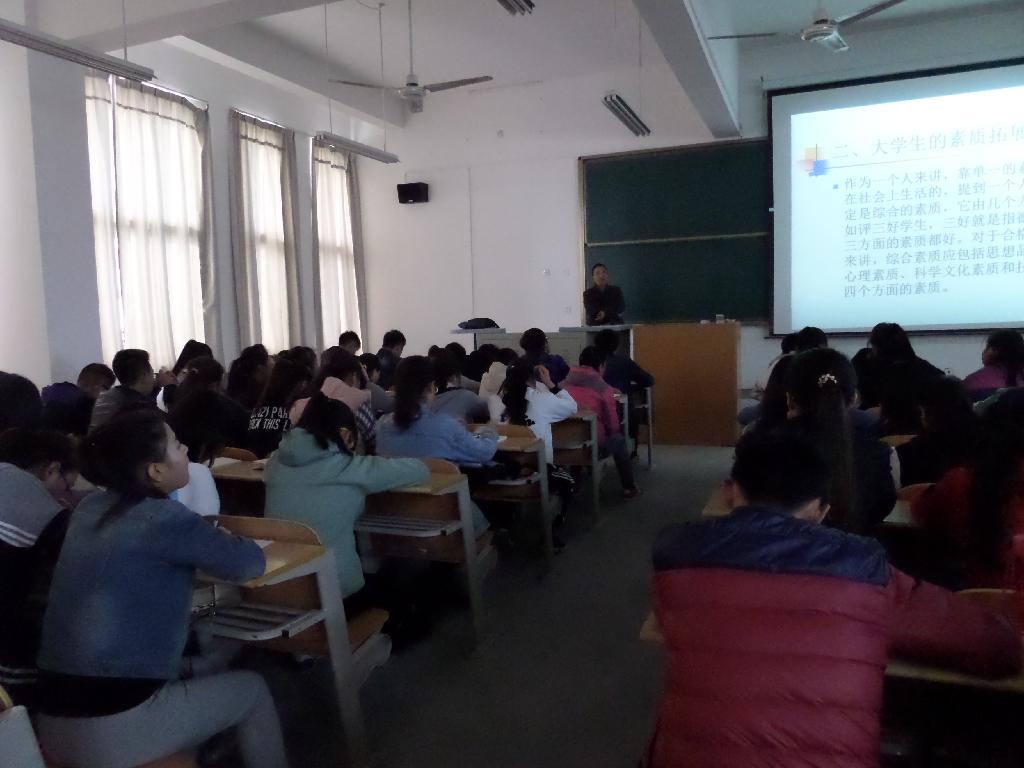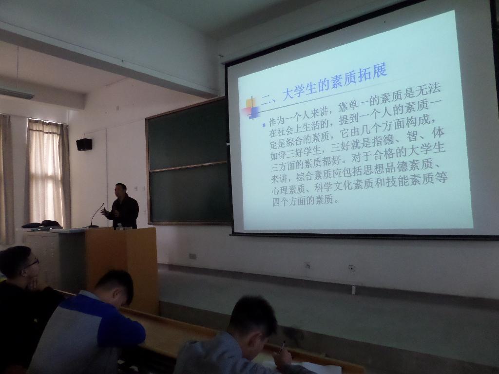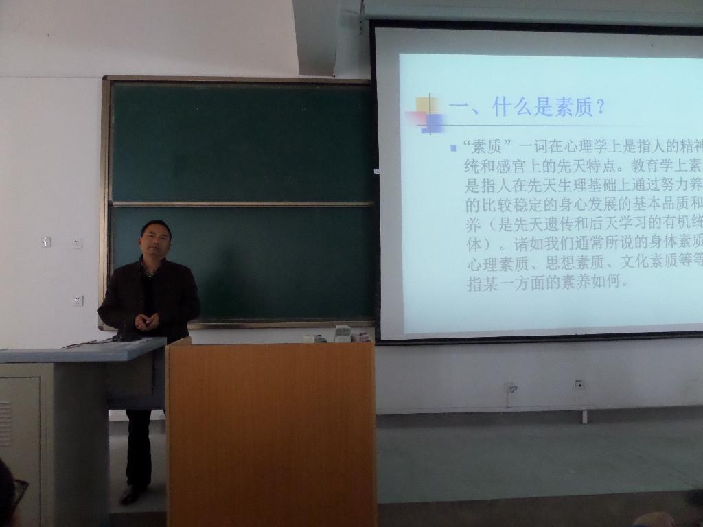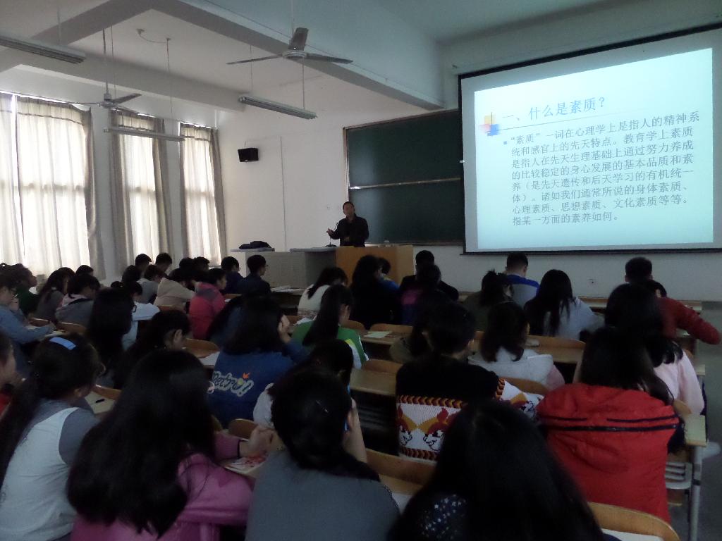 首先,何教授提出“什么是素质?”并从心理学和教育学两方面来进行阐述。其次,何教授认为单一的素质无法在社会上生存,大学生的素质拓展显得尤为重要。他从心理素质、心理素质、科学文化素质、技能素来论述,并举例进行论证,让同学们了解到素质的重要性,树立做文明人,讲诚信,积极践行社会主义核心价值观的''三有''公民目标,展现大学生的良好风貌。接下来,何老师告诉同学们大学四年应该结合自己的专业为以后找工作并做哪些技能准备,使同学们树立正确的就业观、择业观。最后,本次讲座在同学们的热烈掌声中圆满结束。