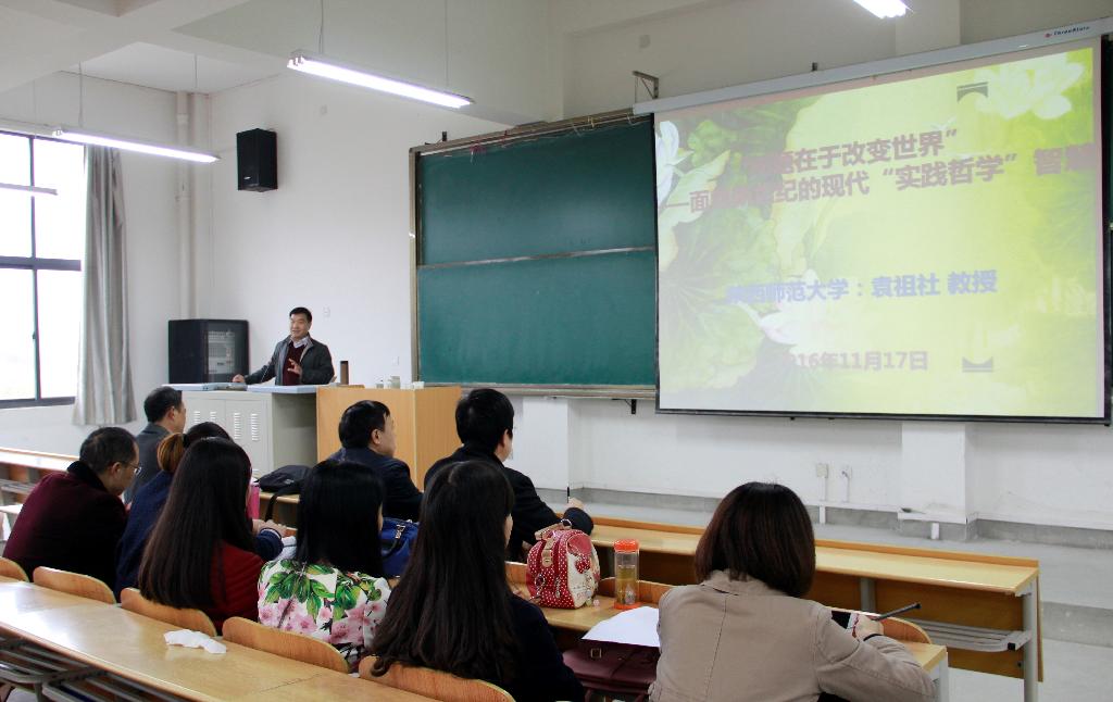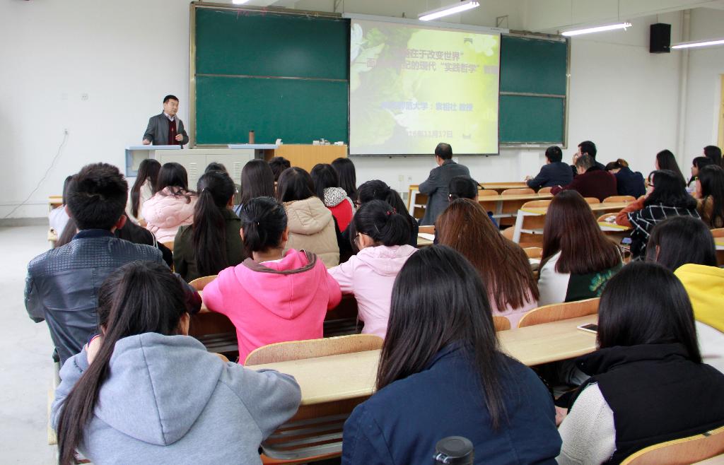 2016年11月17日16:00,政治与社会发展学院于安康学院江北校区1号教学楼1301教室举办了''问题在于改变世界——面向新世纪的现代''实践哲学''智慧''专题讲座,本次讲座特邀陕西师范大学袁祖社教授担任讲座主讲人,并由政治与社会发展学院全体学员参与此次讲座。