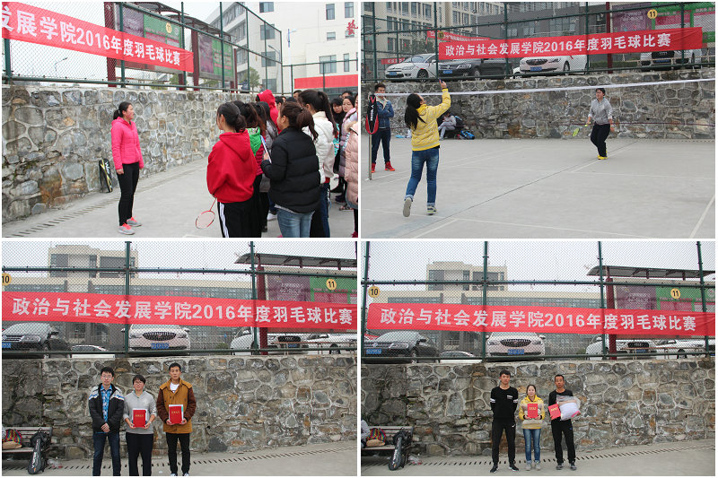2016年12月10日13:30政治与社会发展学院在江北羽毛球场举办了2016年度羽毛球比赛。此次比赛特邀体育学院的赵琼、张琳、张敬、吴丹、刘开伟、姚丕林、孟京正七位同学为比赛裁判,政治与社会发展学院的同学们联袂上演了多场精彩的比赛。