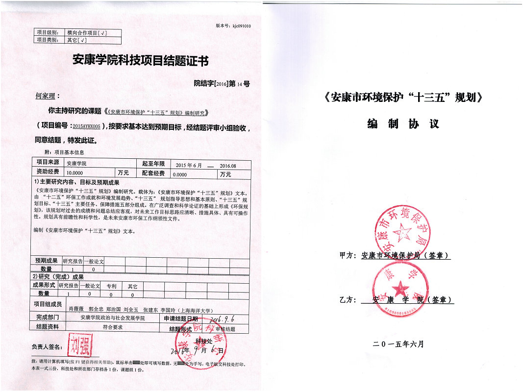 课题组在汉江沿岸7县2区调查的基础上,先后开展专题研讨会议22次,编制《安康市“十三五”环保规划》文本8稿,历时一年编制完成。2016年6月27日在安康学院举行了《安康市“十三五”环保规划》课题结题评审会,安康学院副校长向纪明、科研处长刘强,安康市环保局副局长阮英斗、安康学院课题组成员、7名评审专家和安康市环保局相关科室成员20多人参加了结题评审会议。课题组编制的《安康市 “十三五”环保规划》通过了专家评审。整个《规划》编制过程中,得到了安康市环保局和安康市相关职能部门的大力支持。