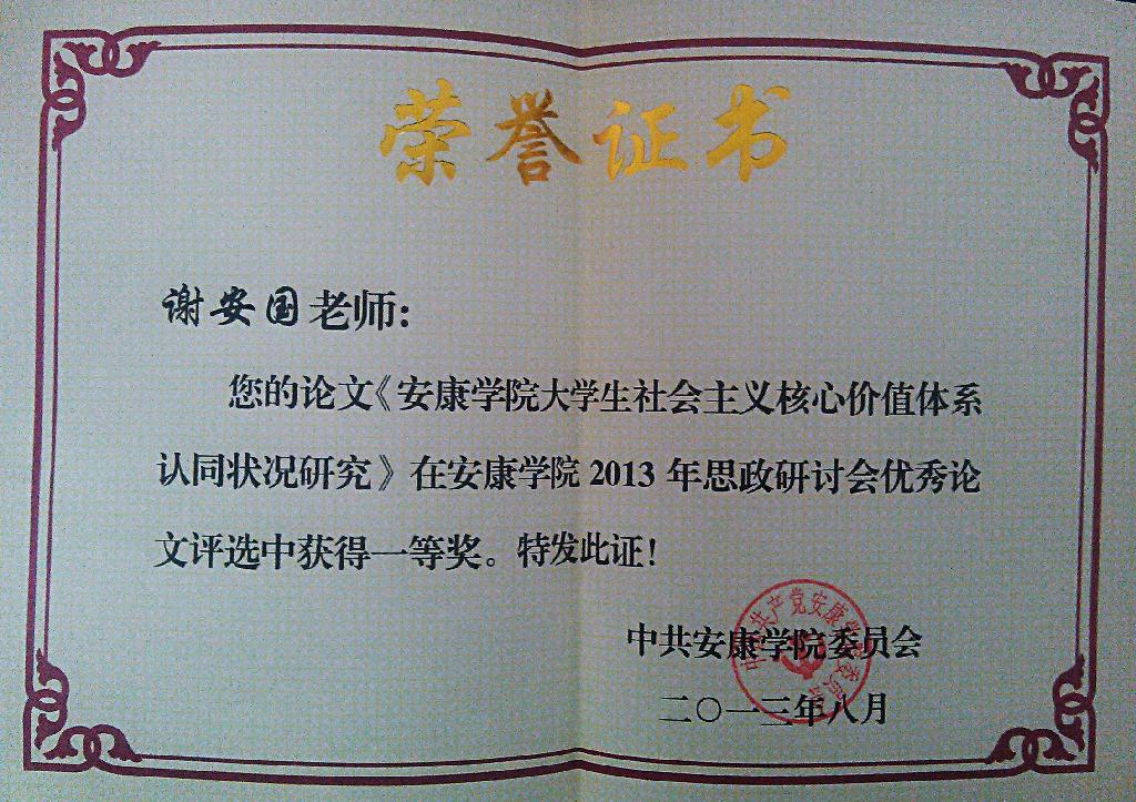 从日前结束的安康学院思想政治工作研讨会上获悉,我系谢安国教授撰写的《安康学院大学生社会主义核心价值体系认同状况研究》、吴亚娥副教授撰写的《安康学院思想政治理论课实践教学形式探索》荣获安康学院2013年思政研讨会优秀论文一等奖;纪安玲副教授撰写的《以考核方式改革为突破口 增强思政课教学的实效性总结》、雷红霞副教授撰写的《思想政治理论课“三维一体”实践教学模式改革初探》、陈卓老师撰写的《高校德育功利化倾向探析与思考》荣获安康学院2013年思政研讨会优秀论文二等奖;李峰老师撰写的《论思想政治理论课的主渠道作用》安康学院2013年思政研讨会优秀论文三等奖。