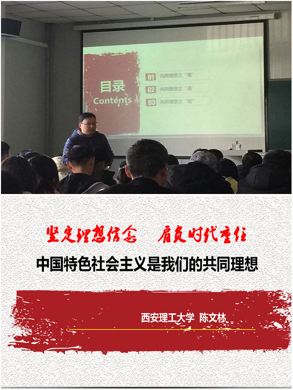 西安理工大学陈文林老师在江南校区为2018级数学与应用数学两个班学生讲授“坚定理想信念,肩负时代重任——中国特色社会主义是我们的共同理想”。陈老师以现实数据从共同理想之“是”、共同理想之“源”、共同理想之“路”三个角度回答中国特色社会主义是中国人的共同理想,使同学们清楚实现人生价值、实现中国梦,当代大学生必须坚定理想信念,肩负时代重任。