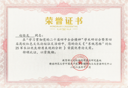 2025年11月23日,由赣南师范大学主办的“高校红色文化论坛”学术研讨会在赣州市举行。赵临龙教授的论文《“系统思维”的红25军长征优良特质表现的分析》入选并安排发言(由新疆大学研究生张雯君代)。论文从红25军长征的历程、红25军长征的特质剖析、红25军长征红色旅游发展方略等方面进行讨论。得到参会人的认同。最终经专家评审获得优秀论文奖。